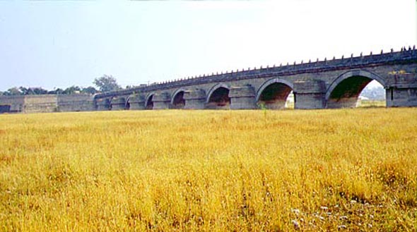 The Luguo Bridge, also known as the Marco Polo Bridge, has been standing over the Yongding River for 800 years. It is made of huge granite blocks, with carved stone lions crouched along the railings.